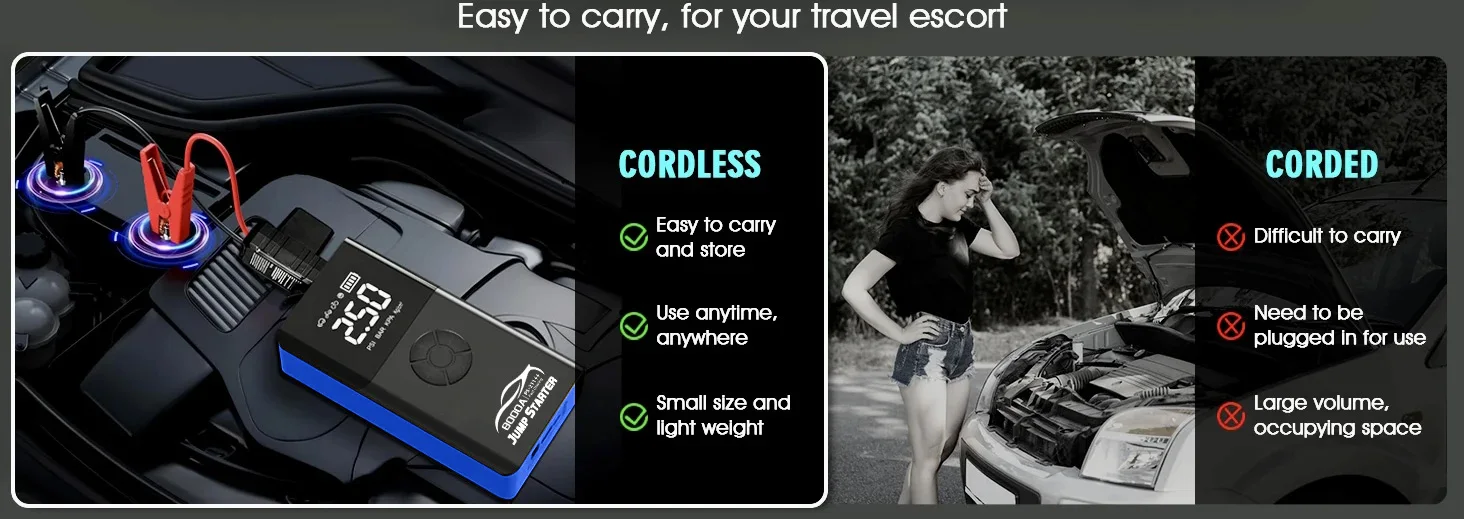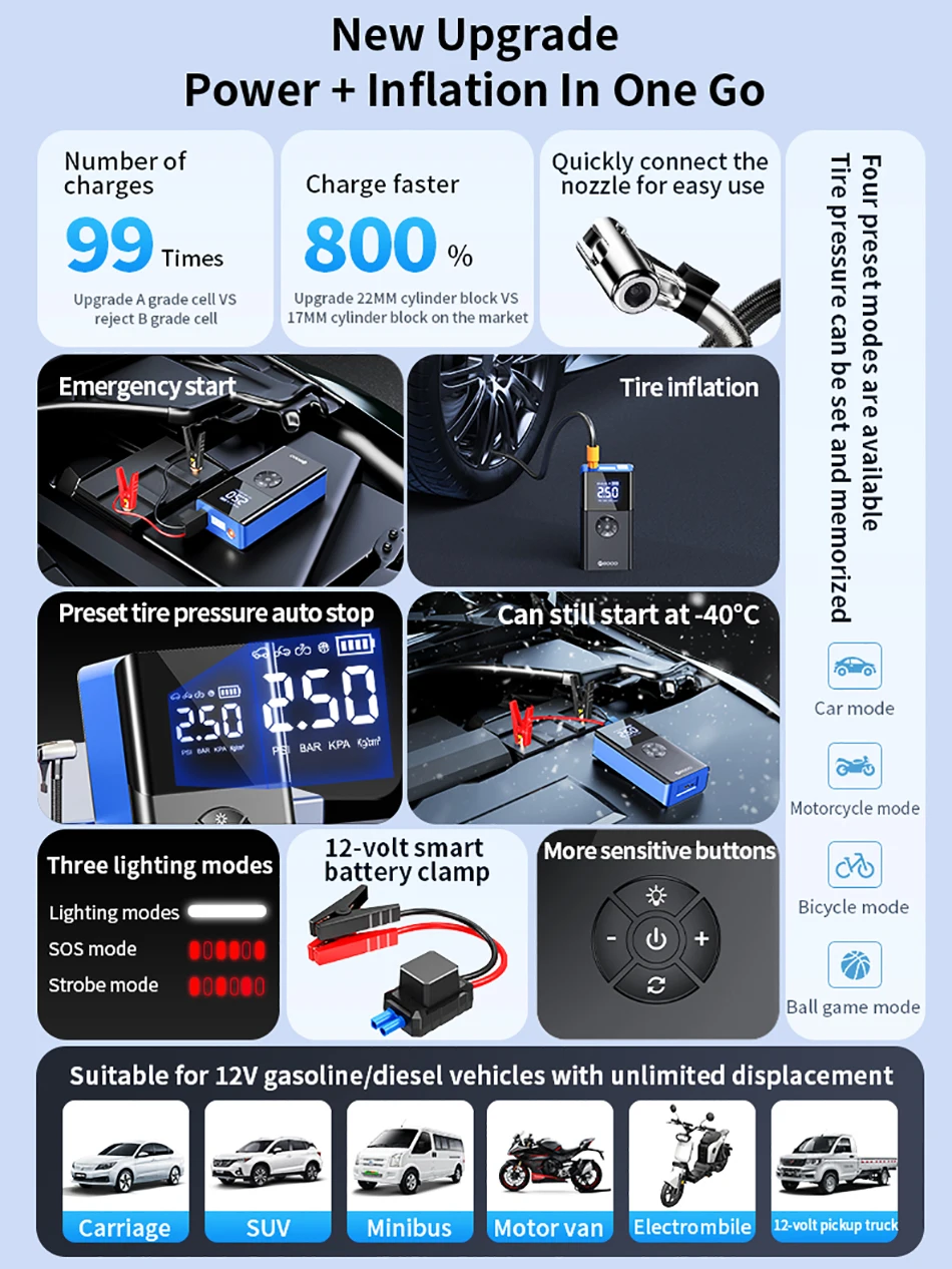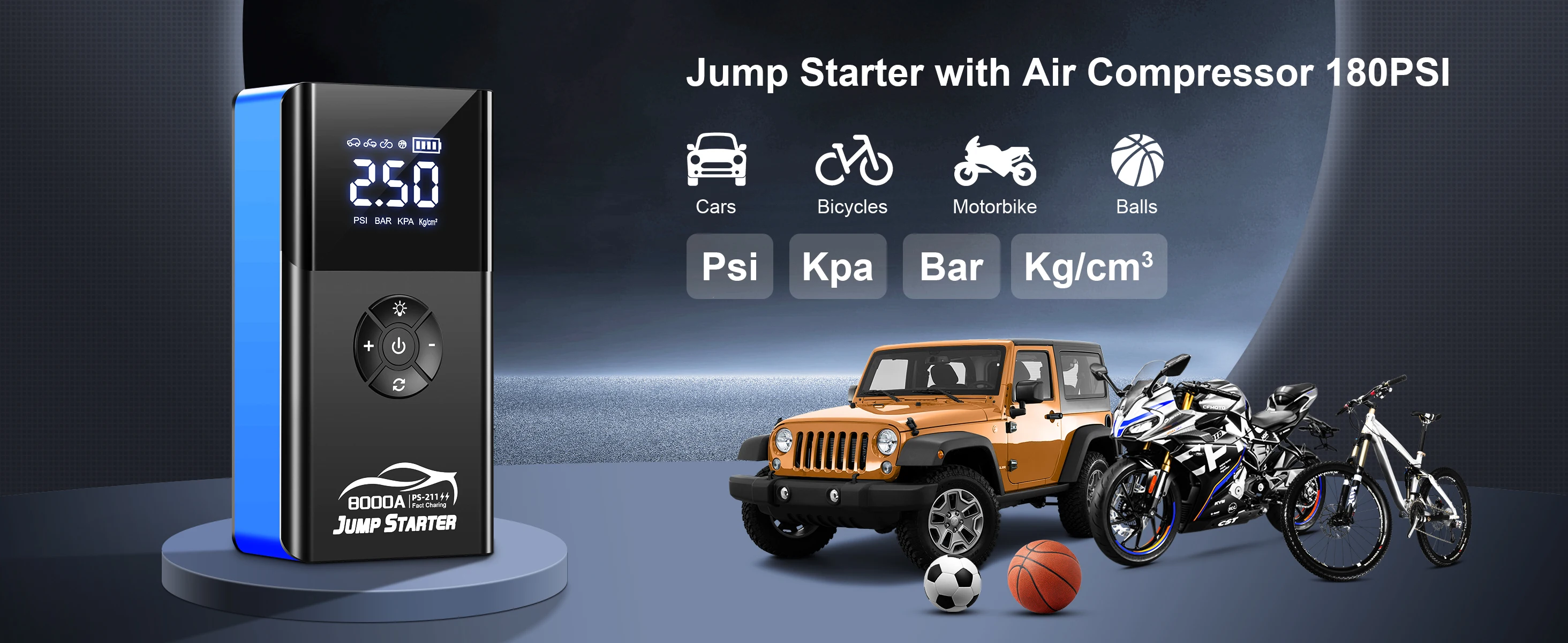 Not Only Can It Generate Electricity Or Inflate Your Car, It Can Also Be Used As A Power Bank. The Large Capacity Means You don't Need To Worry About Power Shortages. If You Are An Outdoor Or Cycling Enthusiast, PSOOO Car Jump Starter Can Also Inflate Your Bicycle Or Tent, And It Comes With A Powerful Outdoor Led Light.
